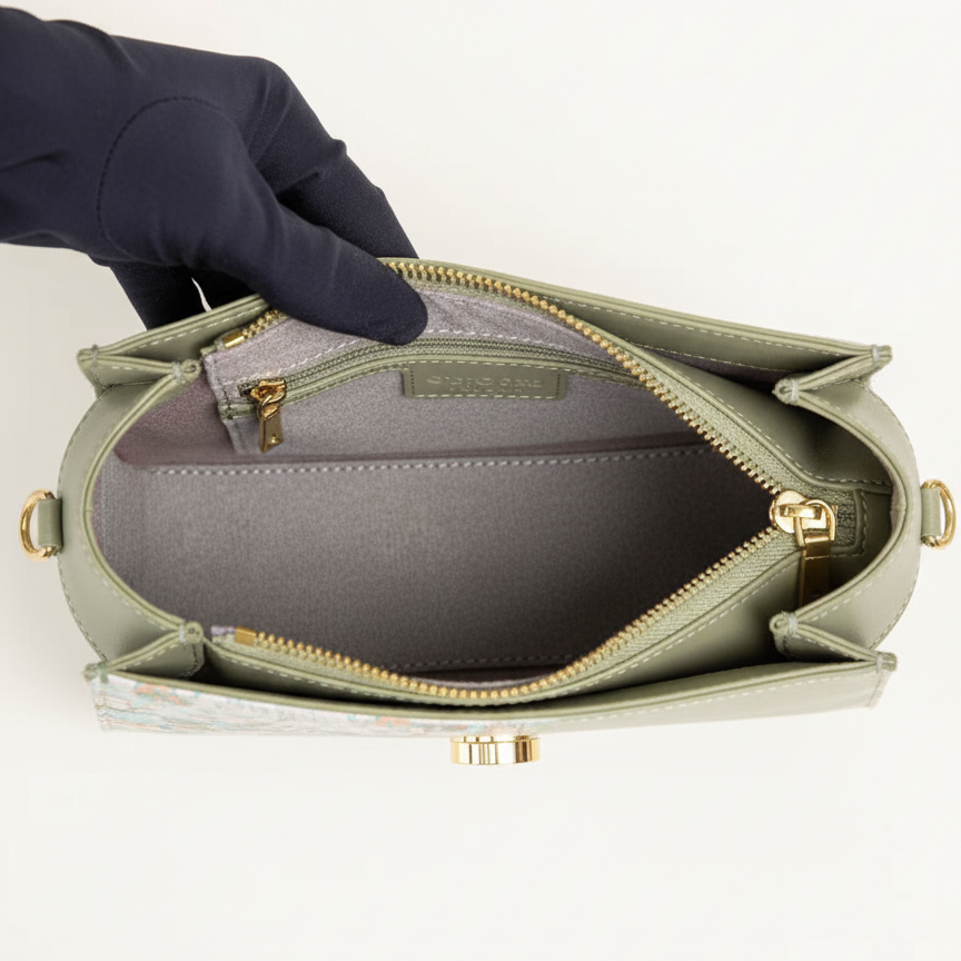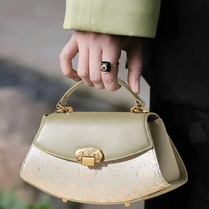 Inspired by classic ancient artistry and modern minimalism. Each thread of brocade is carefully woven into intricate floral motifs — you can feel the 3D patterns under your fingertips. Structured shape, delicate stitching, and protective metal studs at the base reflect true craftsmanship.The best exquisite evening bag you've had in 2025.