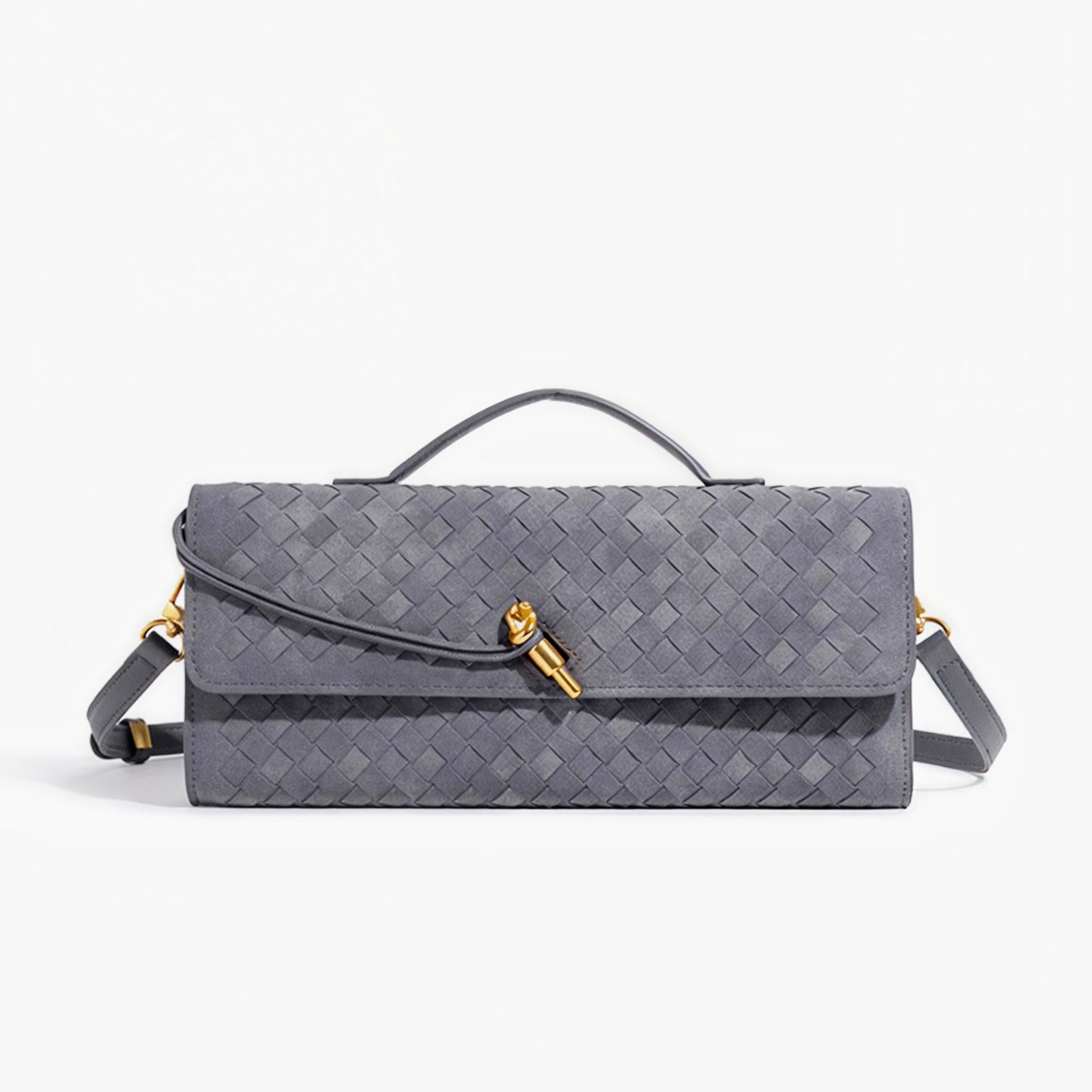 Crafted from premium faux suede, each woven handbag showcases tight, even cross-weaving that resists wear and keeps its shape. The gold metal buckle adds a refined accent — transforming a simple suede purse into a statement of modern femininity.